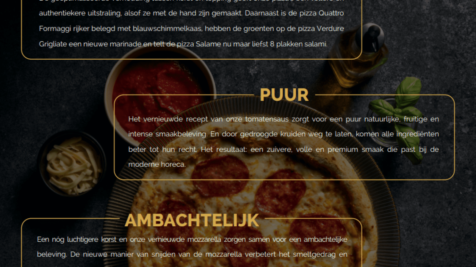 We hebben ons pizza assortiment verbeterd, met aandacht voor elk detail. Een authentiekere uitstraling, een tomatensaus met vollere smaak en een verbeterde textuur van de mozzarella. Alles met één doel: de ultieme pizza-ervaring bieden aan gasten in de horeca.