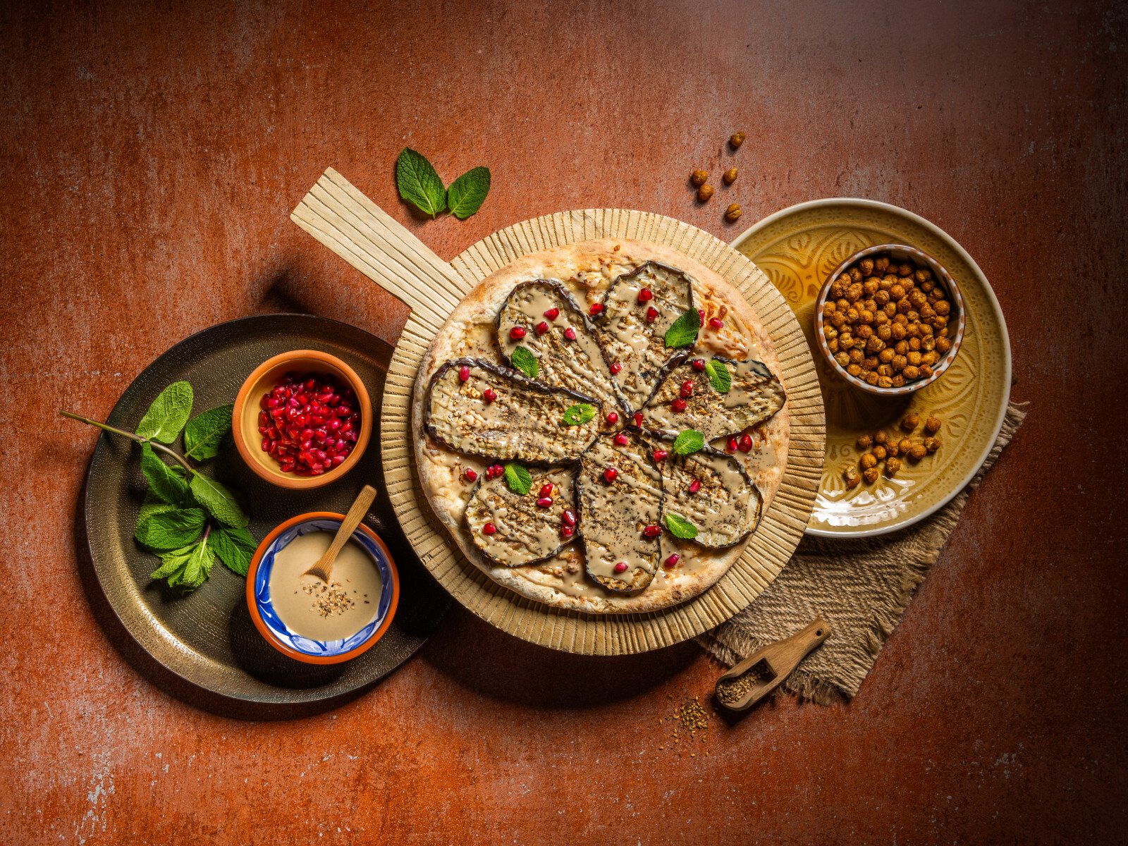 Bak de pizza af volgens de gewenste baktijd en temperatuur. Afwerking Besprenkel de pizza met de tahini‑dressing. Garneer met granaatappelpitjes en verse munt.