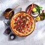 Een kruidige fajita‑pizza met vegan kip, paprika, ui en een frisse chimichurri‑drizzle.Ingrediënten / Benodigdheden